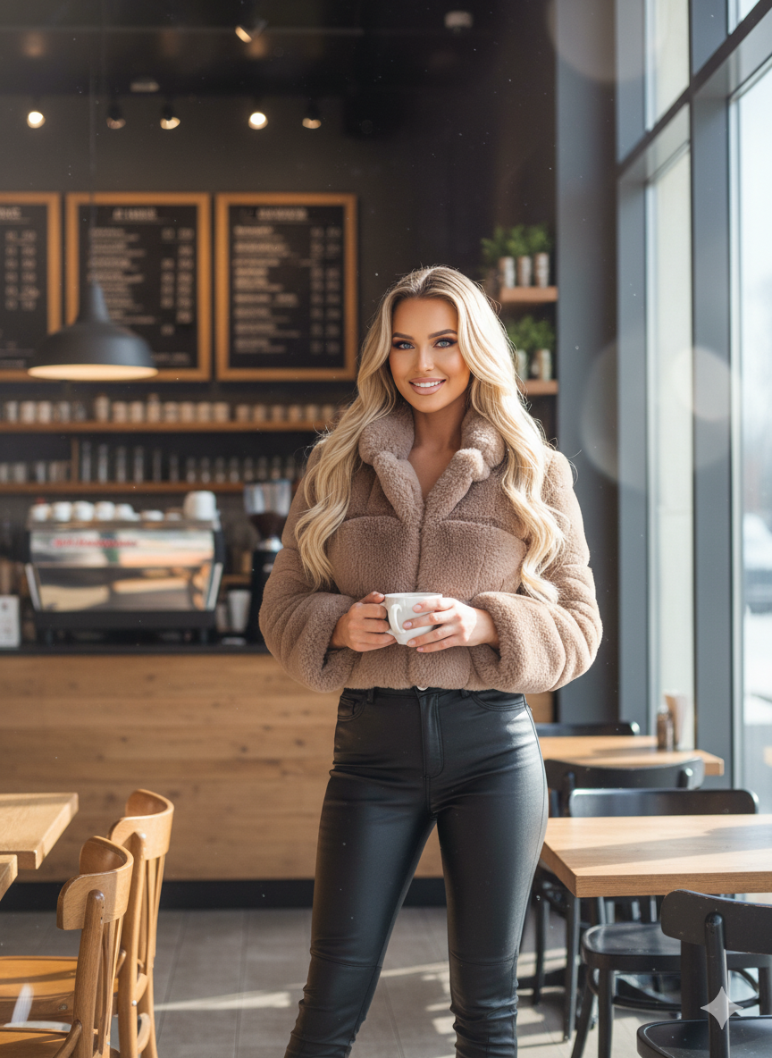 This is a Faux Fur Crop Jacket with a High Neck/Collar.