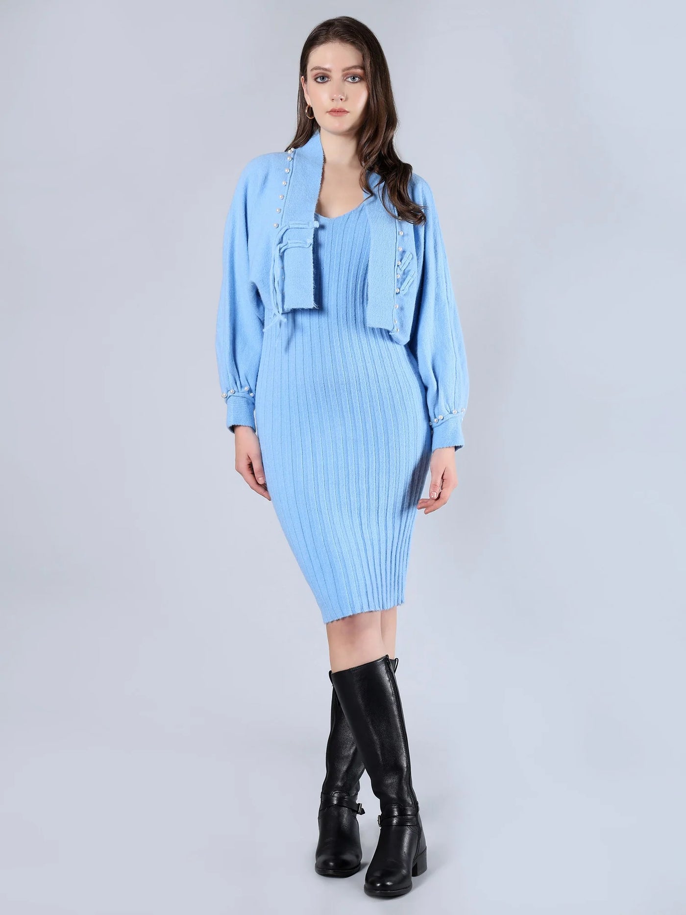 Women Beaded Frog Button V Neck Knitted Sweater Cardigan Sleeveless 2 Pcs Dress - Blue / S/M