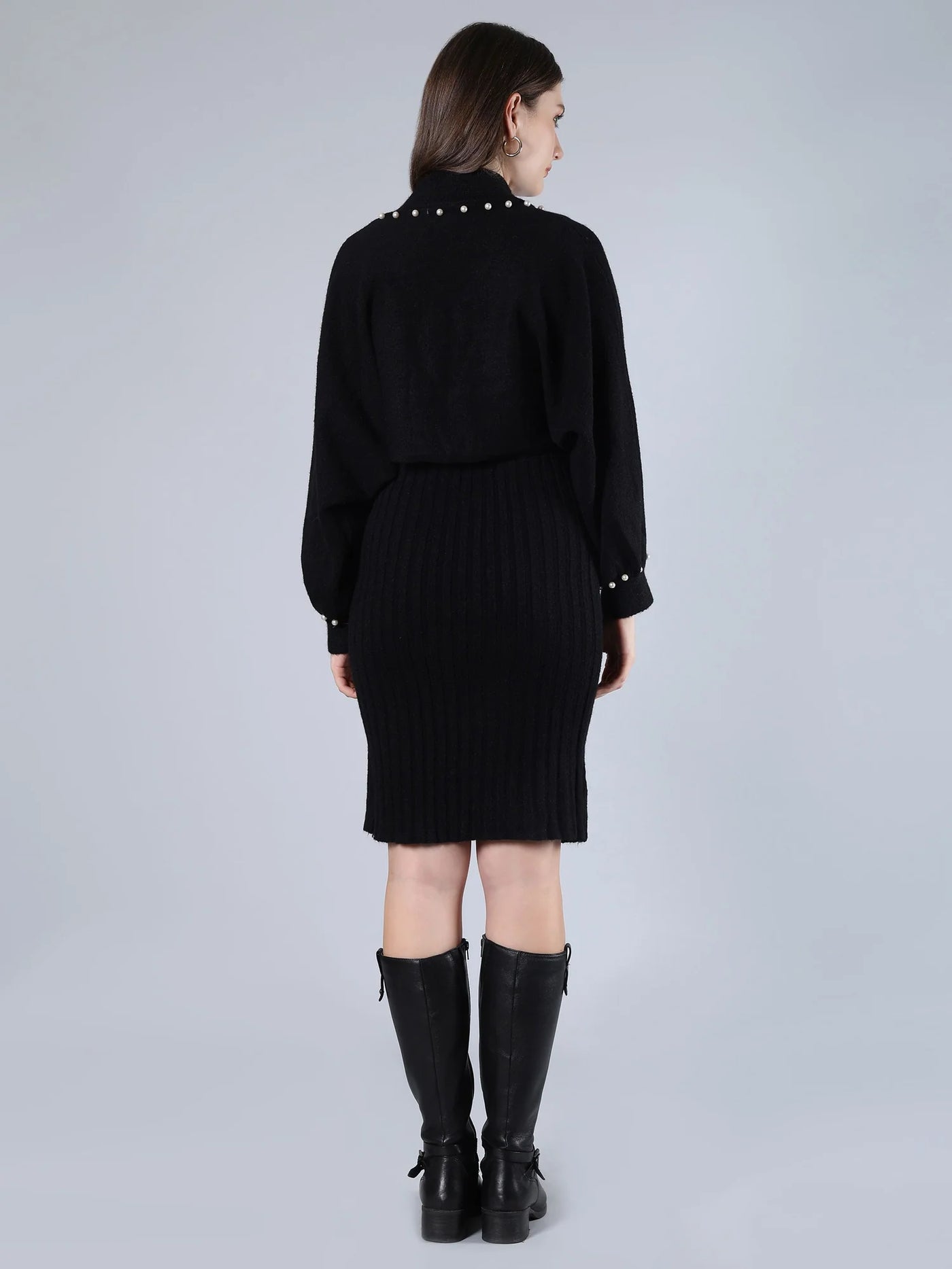 Women Beaded Frog Button V Neck Knitted Sweater Cardigan Sleeveless 2 Pcs Dress