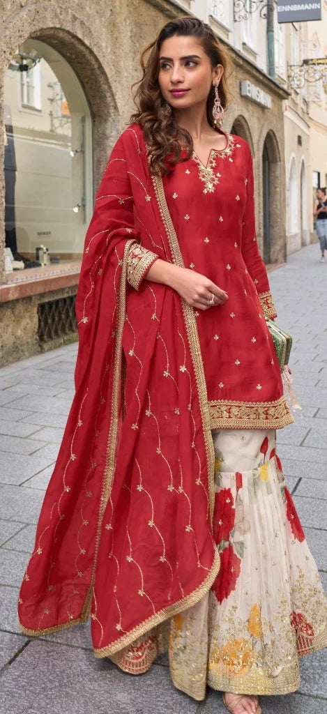 Falita Fancy Worked Exclusive Designer Real Chinon Palazzo Suit - Red / XL